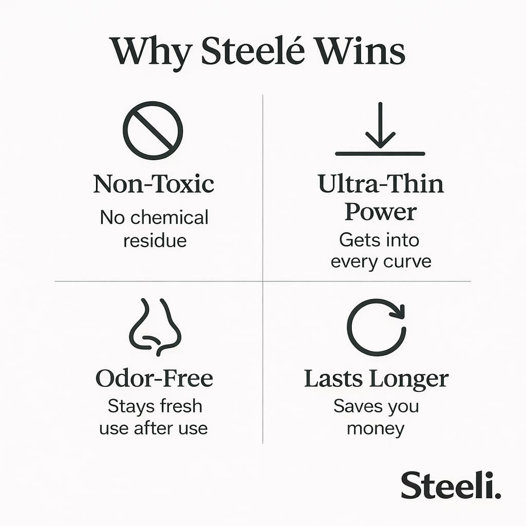 The mineral-based abrasive surface on our flexible core cuts through years-old stains and burnt-on mess with ease. Your stainless steel regains its mirror-like finish without any scratching or damage, every time. Each sponge is designed to adapt to curved surfaces and hard-to-reach corners, ensuring a thorough clean from pan bottoms to pot rims.